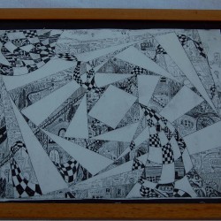 Schuivende rechthoeken doortrokken van de banden van Eschers groet, soms leeg soms gevuld met kindertekeningen. Traptrein en Treintrap zijn broertjes van hetzelfde idee.