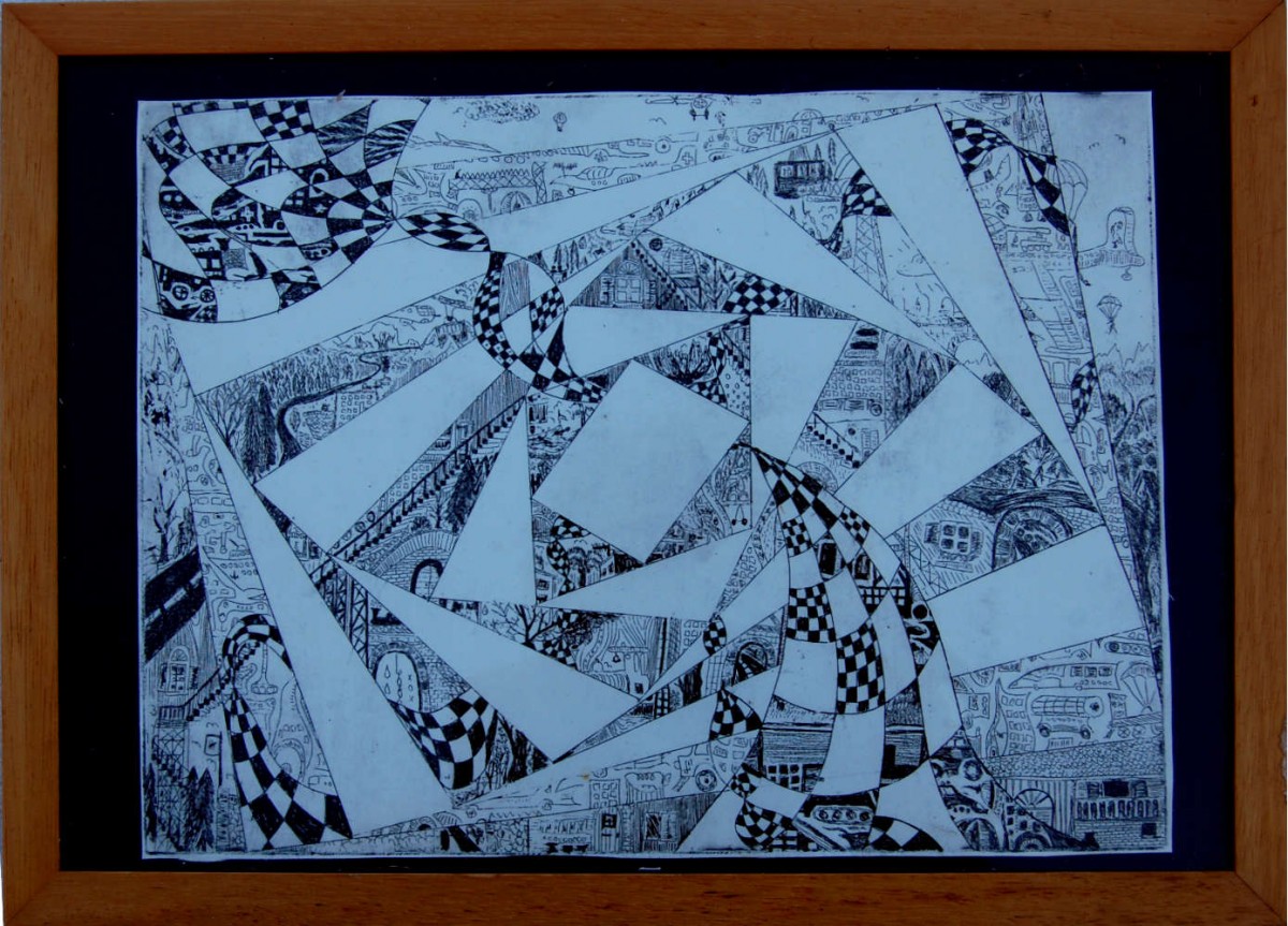 In “het prille begin” laat ik mijn allereerste etsen zien waar ik motieven van kindertekeningen met grafische motieven combineer.